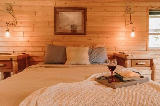 这间豪华私人小木屋坐落在树林中,毗邻私人池塘。距离奥格尔贝公园仅几分钟路程,靠近惠灵市——您可以选择私密空间,享受独特的体验。