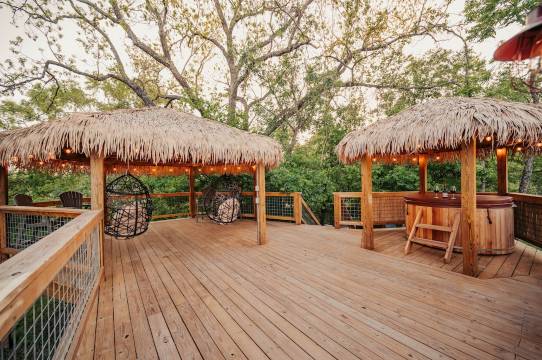 走出户外,来到宽敞的茅草凉亭下,您会发现一个令人愉悦的户外休闲娱乐区。想要**享受?那就沉浸在温暖舒适的雪松木热水浴缸中吧。在绿树环绕的自然美景中,尽情放松身心,让烦恼烟消云散。