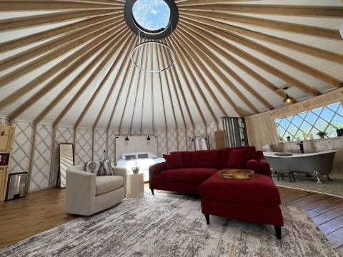 鲜艳的红色毛绒沙发床是“爱情鸟”蒙古包开放空间中引人注目的亮点,为您的浪漫之旅增添了一丝优雅与舒适!它非常舒适,可为客人提供额外的睡眠空间。