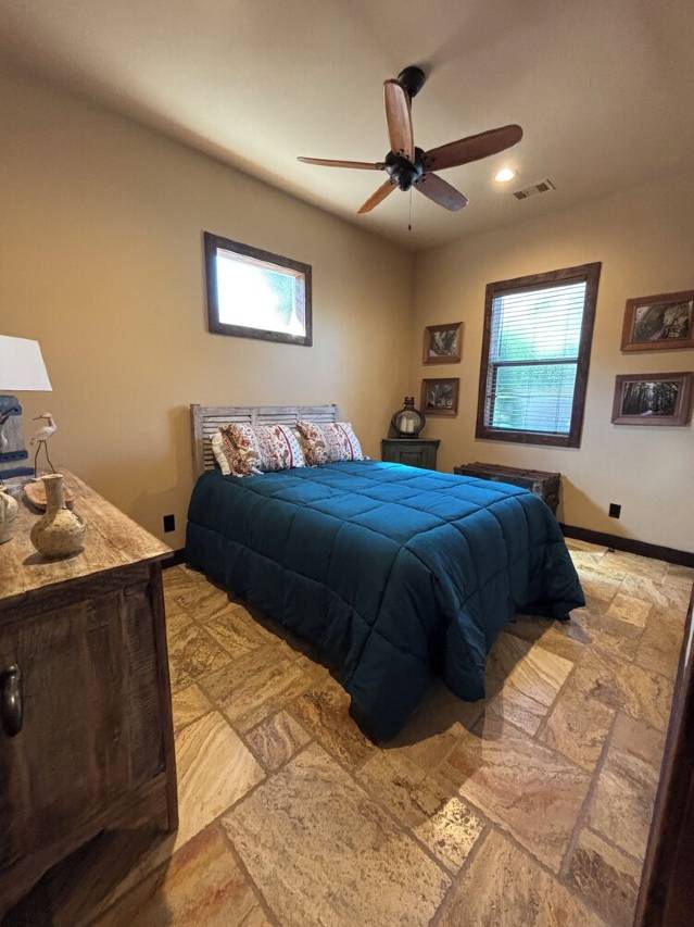 这是一栋单层住宅,面积 2,638 平方英尺,带有双车位车库。三间卧室,2 1/2 个浴室,主卧室配有一张特大号床、步入式淋浴间、大浴缸和步入式衣橱,第二和第三间卧室配有大号床。办公室里还有一张全尺寸床垫可放置(办公室没有门)。