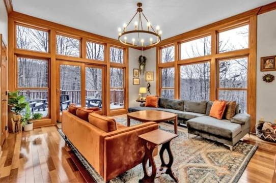 坐落在树梢之上,这间宽敞时尚的住宅是您下一次家庭度假的理想之选。地理位置优越:安静私密,距离霍利蒙特 3 分钟路程,距离城镇 6 分钟路程,距离假日谷 11 分钟路程。这间住宅拥有 3 层楼的起居空间,包括 2 间客厅、一间设备齐全的大厨房、4 间卧室、3.5 间浴室、11 张床、2 张折叠床,可容纳 19 人入住。特色:桑拿、双人按摩浴缸、无线网络、3 台电视、大露台、雪橇坡道、烧烤和随处可见的自然风光。