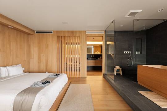 浴室设计灵感源自日本沐浴文化:温水、柔和的灯光、天然材质以及宁静的氛围。光滑的石材表面和深邃的桧木浴缸营造出水疗般的浴室氛围,鼓励宾客享受舒缓的沐浴仪式,彻底放松身心。无论是结束一天的城市生活后,还是与爱人在蜜月或周年纪念日共享浪漫的烛光浴,这里都是理想之选。
