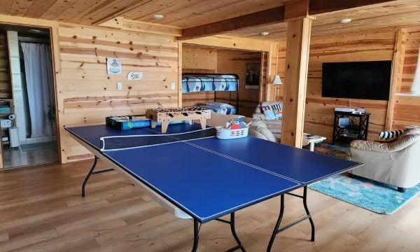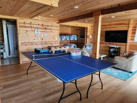 装修完毕的地下室几乎是一个独立的空间,配备了带淋浴的卫生间以及开放式的餐厅、起居室和卧室。游戏包括Xbox(需连接您的账户)、乒乓球、迷你桌上足球和迷你空气曲棍球。额外支付 50 美元,即可提供一张双人充气床垫。地下室入口位于第二间卧室,因此我们配备了隐私屏风,方便您将该房间隔开。