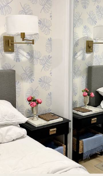 卧室有一张带抽屉的特大号床、12 英寸记忆海绵床垫、4 个特大号竹枕头、从我的家具店买来的复古仿竹手绘床头柜、豪华被子、带额外衣架的双镜衣柜、大型摇摆黄铜壁灯、隐私百叶窗和遮光窗帘、大型 6 抽屉梳妆台和衣柜里额外的 4 抽屉手绘仿竹梳妆台。