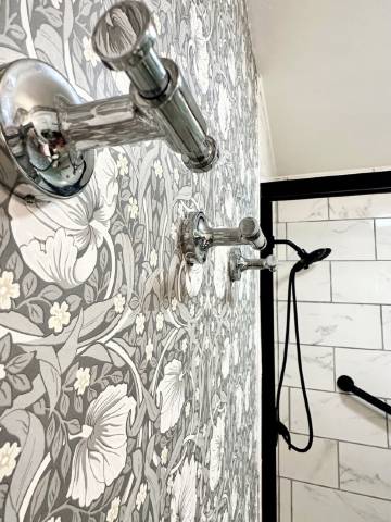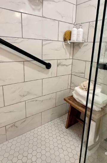 浴室配有步入式淋浴间和扶手、新的 Subway 和 Penny 瓷砖、带石英台面的浮动浴室盥洗台、柚木长凳、黄铜竹镜、RH灯具和4个毛巾钩,以及另外2个用于挂泳衣、浴袍和摩恩水龙头的挂钩。