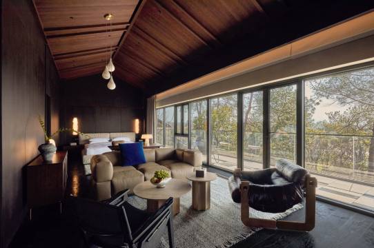 我们住在小山上,和酒店大堂之间需要乘坐接驳车,不算太麻烦,随叫随到。房间的设计风格很符合“山里的房间”,木质、铁椅、粗陶、颗粒感,充斥房间的各个角落,只可惜窗外的树还没有生长起来,不然窗外的景色会更好。房间内有个很可惜的地方就是,放置咖啡茶壶的小吧台应该配一个小水池,因为烧水、泡咖啡、一进门的洗手都是需要的,而不是绕到厕所去洗手。除此之外,一切都好。