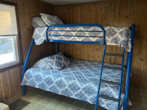 一间卧室配有一张双人床,另一间卧室配有一张双层床(上层床垫为单人床,下层床垫为全尺寸)。此外,公共区域的蒲团可以折叠成一张全尺寸床垫。因此,小屋最多可容纳6位成人(但这个空间最多可容纳4位客人,可能最舒适)。