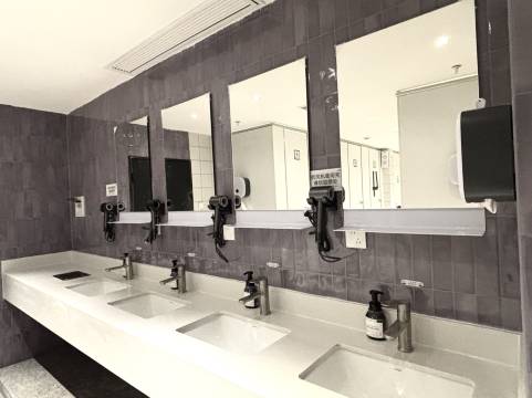洗澡间也特别细节!!就是挂衣钩在门上面,有三个,然后衣服挂上去以后还有一层防水用的拉伸帘防止衣服被洗澡水溅湿,这个设计对我个人而言超级细节啊!!里面配有沐浴露洗发水护发素,不过我习惯用自己的洗漱用品,就没试。沐浴露听我朋友讲很香。卫生间和浴室是分开的,然后各有卫生纸和纸杯可以用。里面还有音乐。哦对了,男士和女士的洗漱区域是分开的,男士的靠近门口,女士的更靠内,而且上面贴上了男士禁止入内的标志,这让我很安心,转角处也有监控。
