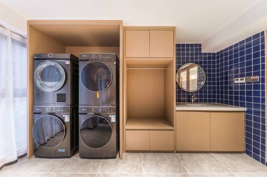 1、房间宽敞,设施齐全,有沙发、椅子、大小桌子等,全屋智能控制。