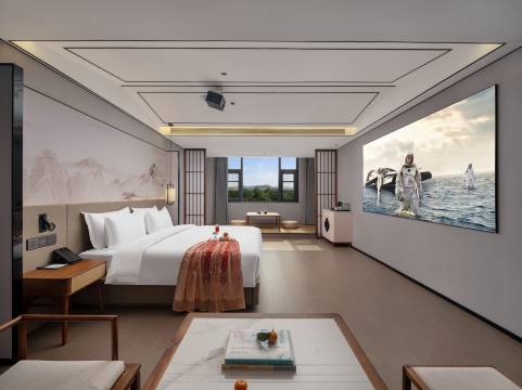 非常值得推荐入住,房间里面空间非常大,还可以看到远处山景,室内装饰也是非常有意境,还给配备了茶台,前台服务和老板都非常热情。