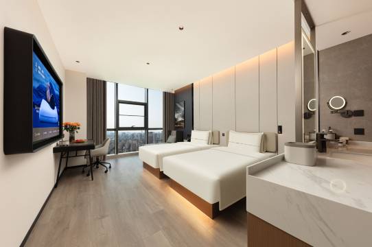 房间干净卫生整洁舒适,无需插卡取电,全部智控可以叫小度帮忙开关设备。前台夜班的小姑娘服务很好,有问题都及时帮忙解决。因为到店时很晚了,没想到有帮忙升级房间,早晨打开窗帘的瞬间景色好美,也算一个小惊喜吧。停车也很方便,下次还会考虑再次入住。