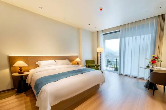 酒店拥有各类客房,大部分房间配有宽敞的私人露台,推门即可饱览元宝山的壮丽山景。房间设计以现代简约风格为主,浅色调的墙面与原木家具相得益彰,营造出宁静舒适的休憩空间。特别定制的乳胶床垫与枕头,贴合人体曲线,为宾客提供舒适的睡眠体验。 酒店大厅特设品茗茶吧,以缙云香茶迎客,伴窗外峰峦品茗观景。健身房、特色餐厅及智能宴会厅,满足度假与商务需求。