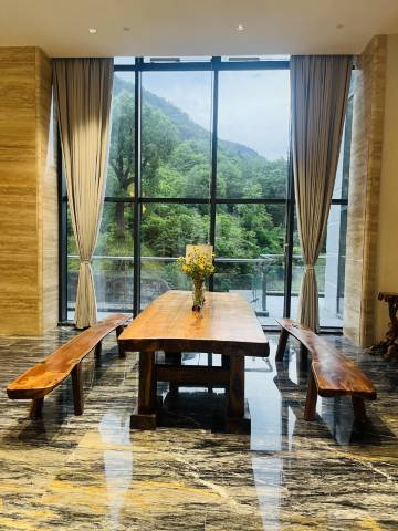新建的度假酒店,大堂够气派但酒店周边配套还没完成,房间还不错,面对山野的落地窗和绿色沙发配上酒店赠送的现磨咖啡,会让人不想出门了。床品卫浴都挺好,独立卫生间小了点。前台服务主动友好,搞卫生的阿姨也很有礼貌。早餐非自助,前台预订简餐后会送到房间来。免费停车。在县郊区空气好,自驾者入住和去景区会更方便。