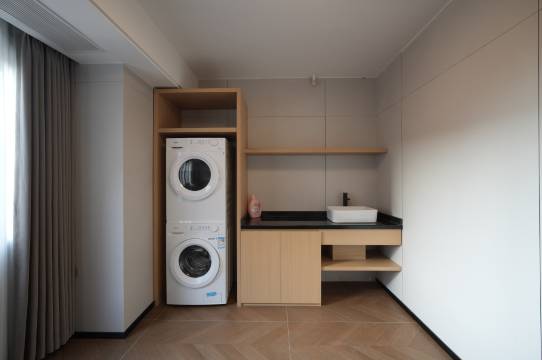 我们是先看后定的,整体看上去房间很宽敞不觉得压抑,环境也很温馨[太阳]卫生也很不错,有洗衣机烘干机出门就很方便,洗衣服啥的感觉就很不错[太阳]房间座椅沙发都有,太棒啦!