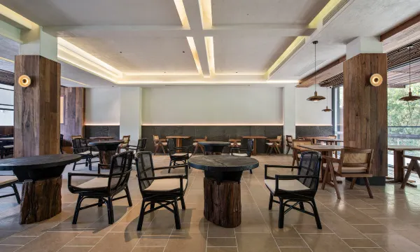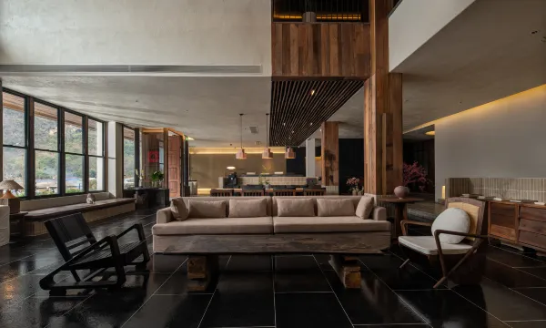 一楼大堂的装修更是可圈可点,原石、原木与绿植的融合自然又高级,能看出设计师花了不少心思打磨。早餐很丰富,吃完后还可以去天台的“天空之境”打卡,镜面与山水相映,日出时分光影绝美,妥妥的出片圣地。