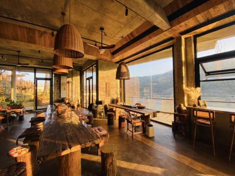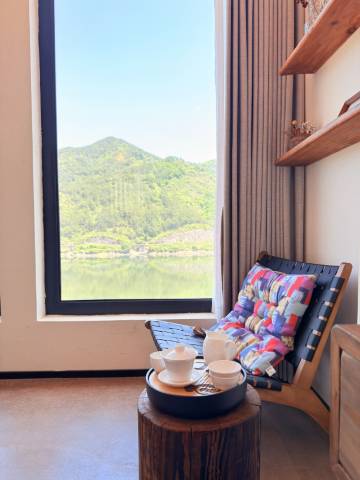 实名安利这家宝藏民宿!推开窗就能独享一线江景,云雾缭绕的青山仿佛触手可及,对面偶尔经过的绿皮火车"况且况且"地唱着歌,给静谧的山水添了份复古电影感。