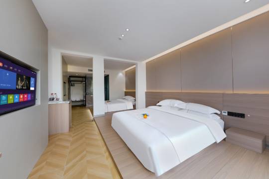 房间非常漂亮,房间很满意,设施实用方便智能小度,房间的床是榻榻米方便带小朋友,老板服务好热情,免费接送方便,卫生间干湿分离实用,干净整洁卫生,一次性用品棒棒哒
