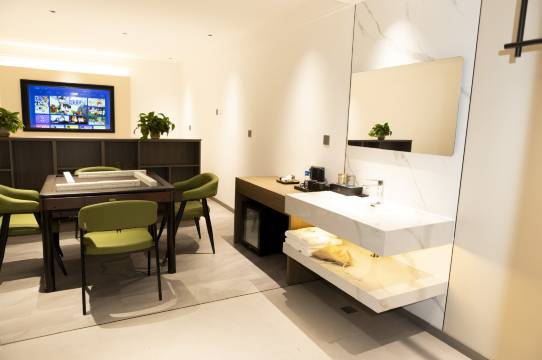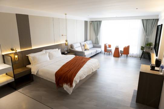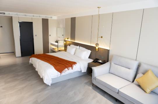 宾馆房间非常大,干湿分离,智能马桶。两米的大床,智能窗帘,装修时尚,配一个小冰箱,没有任何异味,性价比高。刚入住,还特意赠送果盘儿。退房时又给带两瓶水。真的是万分感谢!