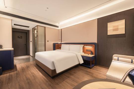 房间比想象中宽敞,装修简约大气,温馨感十足。卫生打扫得格外细致,床品柔软亲肤,床垫软硬适中,一整晚都睡得特别安稳。设施齐全且实用,高速WiFi不卡顿,办公刷剧毫无压力;空调控温精准,热水随开随有,卫生间干湿分离设计合理,洗漱用品品质在线,没有廉价感。