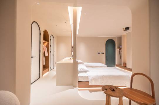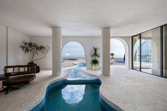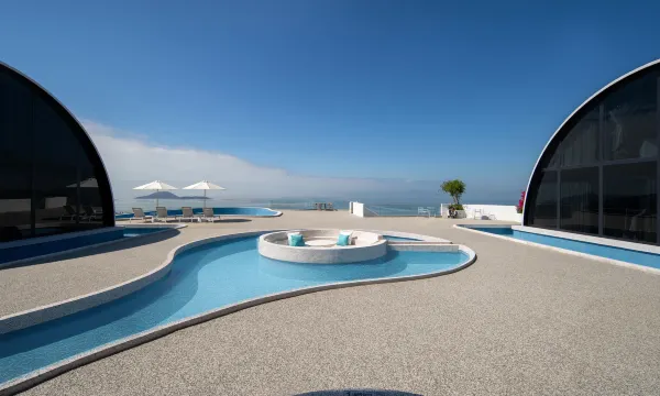 设计:纯白色建筑配上180度无边泳池 悬崖日出和日落 圣托里尼风 无敌出片 不用外出皆是景