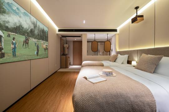 酒店——栖云而居,邂逅山水诗境隐逸于余姚四明山麓的云雾之间,山庄以“山水为邻,云海为伴”为灵感,打造一处远离喧嚣的隐世桃源。这里海拔绵延,四季流转成画,春赏漫山翠色,夏揽星河入梦,秋醉层林尽染,冬遇雾凇琼枝,是都市人回归自然、疗愈身心的理想栖居地。云巅之境,山庄依山势而建,客房与别墅错落分布于山林间,每间房均以全景落地窗揽入山岚云影。客房设计融合新中式雅韵与现代简约美学,原木色调与天然材质呼应自然,部分房型更配备私享露台汤池或观星天窗,让宾客枕星辰而眠、伴鸟鸣苏醒。舌尖风物,余姚至味「山云宴」餐厅以“在地时令”为灵魂,甄选四明山珍、姚江的鲜物,主厨匠心演绎余姚传统风味与现代创意料理。晨起一碗黄鱼面,暮时一盏杨梅酒,佐以云端日落,诠释“食在山野”的惬意哲学。慢享时光,心归自然 - 观云台:晨起可赏云海翻涌,暮时静候霞光浸染天际; - 隐泉SPA:汲取山泉精华,以古法疗愈唤醒身心平衡; - 竹涧茶寮:于溪畔竹林间品茗对弈,聆听自然絮语; - 徒步秘境:专属管家可定制登山、溯溪路线,探秘千年古村与浙东唐诗之路遗韵。山水为媒,人文共情山庄毗邻河姆渡遗址、王阳明故里,将七千年的文明脉络融入体验——可亲手制作仿古陶器,或参与“阳明心学”主题茶会,在山水与人文的交织中,感受余姚独有的精神原乡。见吾乡,见天地,见本心无论是家庭亲子、蜜月私旅,还是企业禅修、文化雅集,山庄以隐逸不隐世的姿态,邀您暂别浮华,于云端之上,重拾生活的诗意与温度。