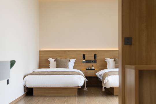 民宿坐落于江苏省常州市金坛区薛埠镇美池温泉度假村内,毗邻国家4A级景区茅山东方盐湖城,步行仅需5分钟即可抵达景区入口,地理位置优越,交通便利。民宿背倚茅山山脉,直面苍翠山景,客房配备全景落地窗,清晨推窗即见云雾缭绕的茅山风光,夜晚可仰望星空,尽享自然静谧。 民宿以“山水栖居”为设计理念,巧妙融合现代舒适与东方美学。客房均以简约原木风格打造,空间宽敞通透,部分房型增设独立观景阳台或露台,搭配茶具与藤编家具,营造出悠然禅意的休憩氛围。客房内设施齐全,地暖、智能家居一应俱全,兼顾都市生活的便捷与乡野度假的闲适。 作为东方盐湖城配套住宿选择,民宿周边旅游资源丰富多元: 5分钟车程内可抵达花谷奇缘(四季花海)、茅山森林世界(户外探险)、宝盛园(艺术展览与竹林秘境); 8分钟直达茅山风景区,登顶祈福、泡温泉、探访道文化古迹皆宜; 仙姑村、高尔夫球场、有机农场等近在咫尺,适合亲子采摘、田园体验。 无论是追求文化沉浸的国风爱好者,还是渴望逃离喧嚣的都市旅人,民宿皆能以山水为幕、以人文为韵,为您呈现一场诗意栖居的逍遥之旅。