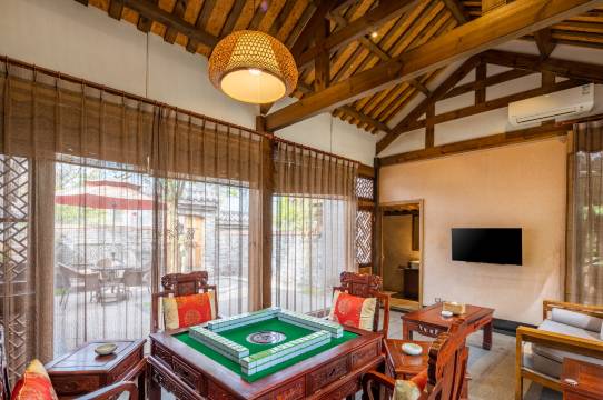 院内有鹦鹉、八哥和古筝演出,还有一汪池水,水中有锦鲤。水边有摇椅可供休息。
