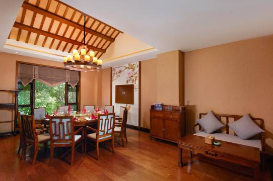 酒店的布局很有设计感,依坡而建,中式园林建筑,亭台楼阁,小桥流水,处处彰显品味及底韵。窗外就是美丽的风景,房间虽然装修有一定的年代感,但是设施设备完好,卫生干净,床品质量很好。欢迎水果及生日坚果满满的惊喜。早餐也不错的,他家菜品很好吃,鱼好吃😋,感觉厨师就是成都的,从第一口早餐的包子,感觉像成都的痣胡子小笼包,这个天坐在露天吃饭喝茶,真的是太棒了👍。