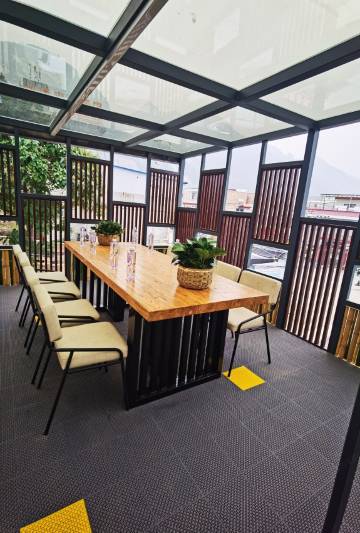 房间大小适中,干净,卫生。透过落地玻璃窗能看到对面的山。一次性拖鞋很舒服,还特意带走了一双。智能马桶,有一次性马桶圈,室内备了八瓶农夫山泉,很不错!干湿分离,就是卫生间内淋浴区和马桶区位置设计不太人性,不过无伤大雅。老板娘服务很有亲和力,很热情