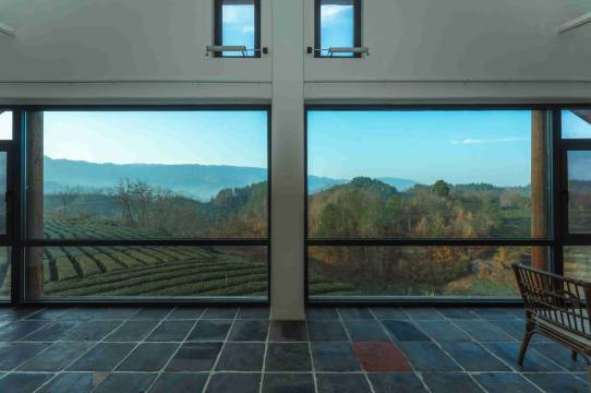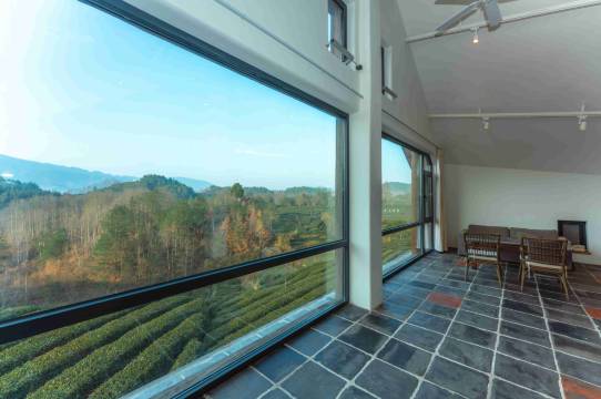 房间的每一处都体现出用心 窗外的自然茶园风景仿佛一个巨幅画框,将一整幅流动的青山图请进了室内。