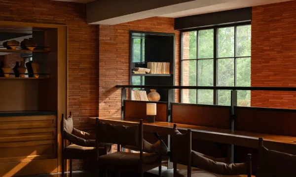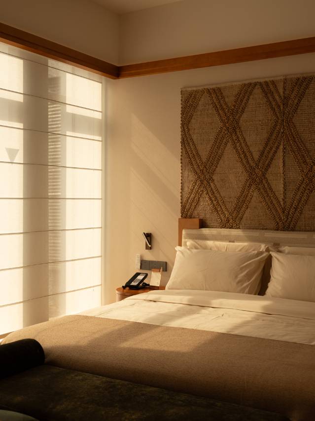 酒店整体色调偏暖,灯光柔和不刺眼,窗外是葱郁的山林绿意,室内则是陶土与木质的温暖包裹,瞬间就能让人从都市的喧嚣中抽离出来。