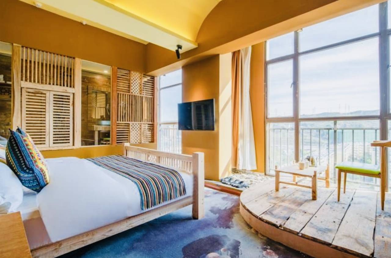 第一眼就可以看到前台大厅那里拍照很出片 第一眼就种草了 尤其我是下午太阳刚刚要下山的时候办入住的 真的巨美 房间也是挺干净的有那种小木屋的感觉 设施也齐全 楼下有很多小吃 半夜忍不住下楼买了很多 服务也是到位而且非常负责 一进去那个房间就给我很多的惊喜 晚上从窗户那里看夜景也是超美 很治愈 早上我们打车也是很方便 总之我绝对不是人机评论哈 是真的很值得入住 已经是好几次入住了