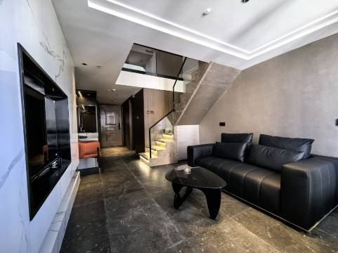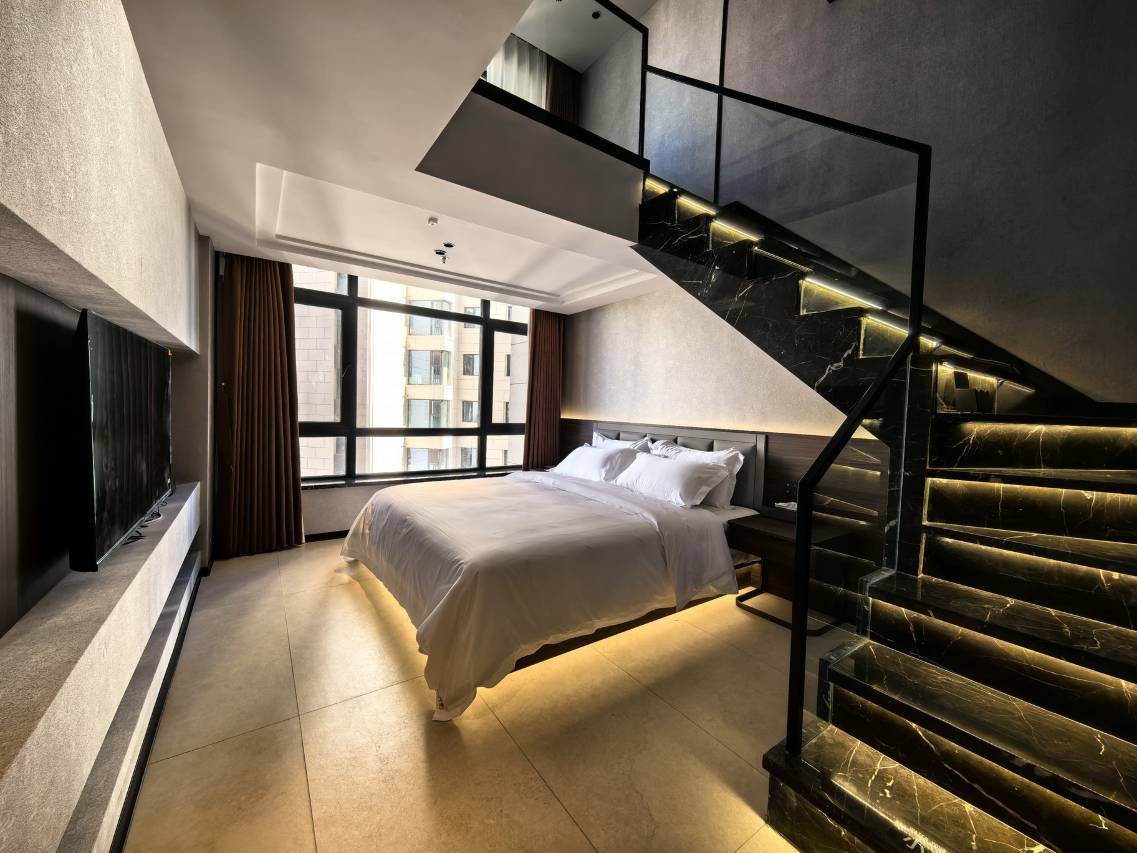 这次入住的loft酒店大床房体验超棒!房间是挑高loft设计,空间感直接拉满,一层的茶台区域布置得很用心,茶具质感在线,闲暇时泡杯茶特别惬意;楼梯和墙面的装饰画搭配得很有格调,大理石台阶质感十足,细节处的“小心台阶”提示也特别贴心。整体装修是现代简约风,木质墙面和软装搭配得高级又温馨,住起来又舒服又有氛围感,下次来还选这家!