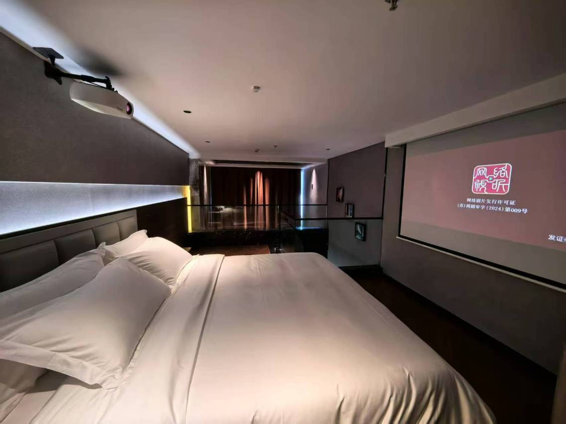 帮朋友订的房间,朋友入住之后赞不绝口,上下两层各有一张1.8米的大床满足多人入住,上面是投影仪,投影效果杠杠滴,下面是电视机,互不影响,卫生打扫的干干净净,一尘不染的样子,第一次来从楼栋前面进来的,走了一层楼梯,后来前台告知从后面进来就不用爬楼梯了,停车场也很近,挺方便的,好评,下次还选这家酒店!