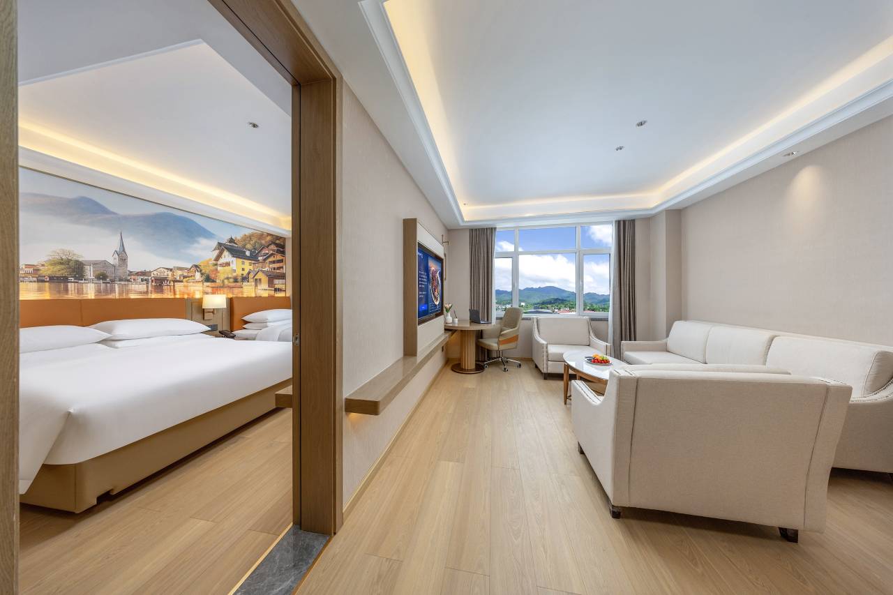 酒店有自己的停车场,车位比较多,很适合自驾旅游人群。前台接待人员耐心细致。房间宽敞明亮,设施一应俱全,而且有智能管家。自助早餐种类也比较丰富,干净卫生,值得推荐。