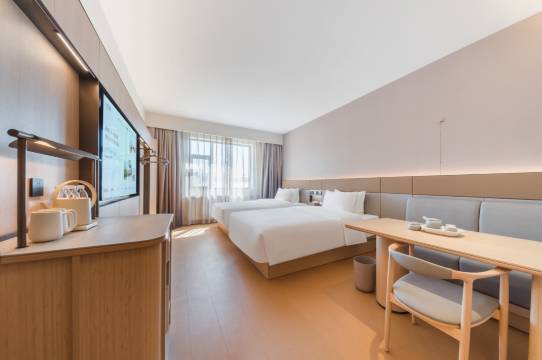 酒店的选址相对安静,外出打车、叫外卖也很方便。25年才开业,环境、设施都很新,卫生干净,装修是明亮休闲的风格,叫外卖是机器人帮忙送到房间,大大的提高客户的私隐度和方便度,我个人很喜欢。订的高级特大大床房,是大窗户户型,第一感觉让人觉得房间的很明亮舒服,碍于开门瞬间闻到烟味和古龙水味,应该是上一位入住的客人留下的,我比较介意,所以联系前台要求换房,前台小姐姐二话不说,马上派人来给我们换了同楼层同等级的房间,就是碍于不是每个户型一样,换过的房间除了窗户小一半,以致明亮度就没有第一间的好,其他都一样。我和队友都觉得吹风机很好用,很快吹干,我们头发多,平时是最讨厌吹头发环节的。唯一我不太喜欢的是,上厕所,还没解决完,马桶感应到人就自动冲水,毕竟我平时是习惯盖上马桶盖冲水的。
