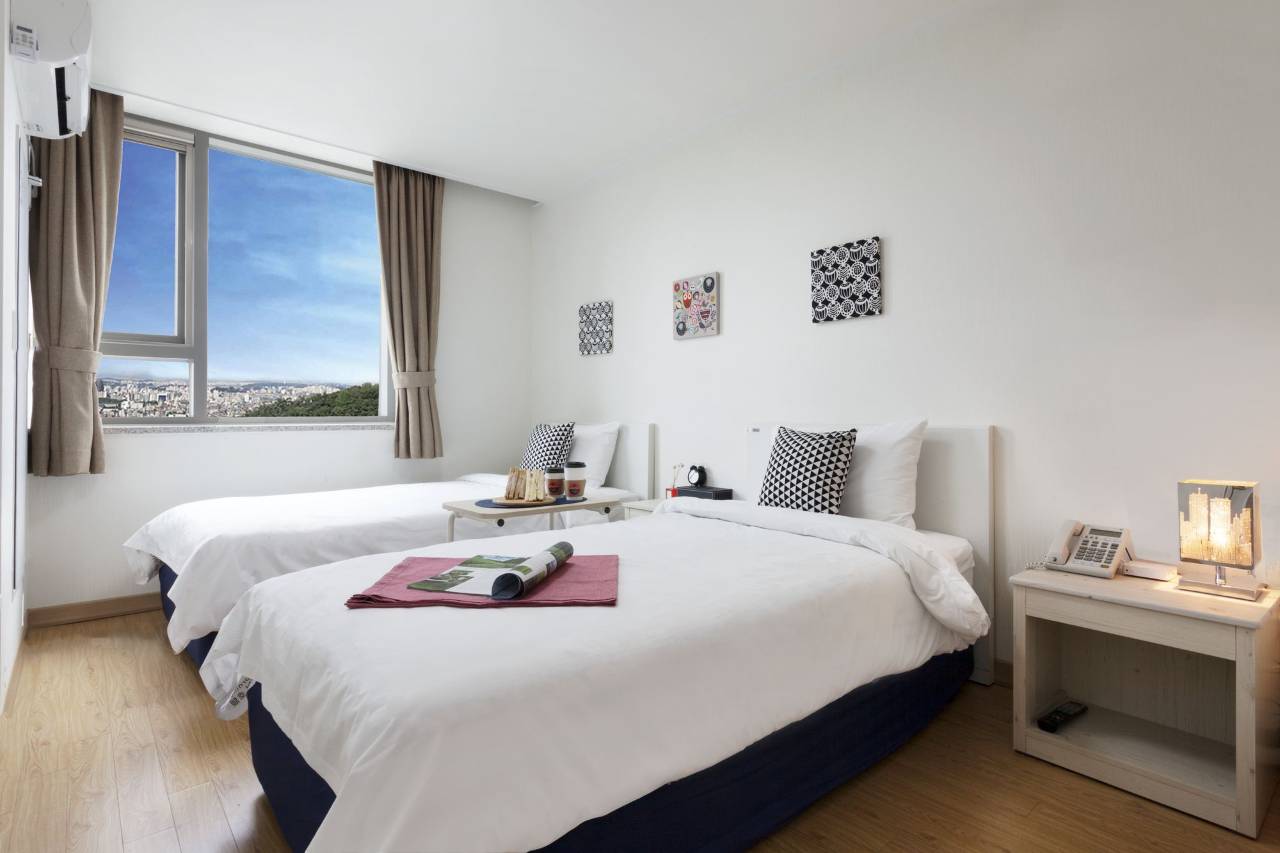 在前台遇到的每一位工作人员都非常友好并且有耐心,可以英文交流,会提供纸质中文介绍,我和朋友两个人第一次来韩国,认为酒店的服务非常好,卫生也很不错,遇到过打扫卫生的工作人员非常尽责和友好,房间采光很好很亮堂,有冰箱,会提供两瓶瓶装水。洗衣服也很方便,房间里有洗衣机,前台可以借晾衣架和领独立包装的洗衣凝珠。交通非常方便,离地铁站步行5分钟,附近有两家711,离明洞、景福宫、北村韩屋村等等景点都非常近。提供塑胶拖鞋,卫生间空间合理明亮干净。