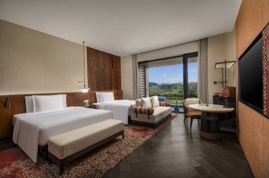 酒店距那拉提景区门口仅约700米,步行几分钟就能进入景区,方便游客早早入园,避开人流高峰 酒店无视线遮挡,无论是在客房、大堂、餐厅还是泳池,都能欣赏到那拉提绝美的草原和天山山峦,仿佛住进了仙境 房间面积46㎡起跳,还有开放式衣帽间、超大浴缸、双台盆洗手台等,布局合理,住起来十分舒适 以哈萨克族游牧风为设计灵感,皮质吊灯、台灯、抽纸盒等细节精致,民族风图案的睡衣、地毯、抱枕等也都是精心设计的艺术品,满满高级感 客房内配备胶囊咖啡机、冰箱等,迷你吧首轮免费,里面有新疆特色饮料和大乌苏等。