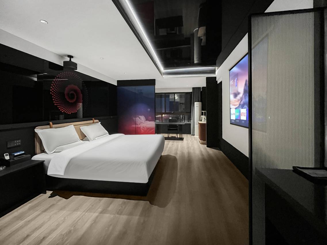 房间性价比还不错,住好几次了,空调制冷快,网络也很给力,可以晚上躺床上看电影还是很不错的,还有免费的地下停车场,楼下就是小吃街,很热闹,离高铁站水晶城都很近,前台小姐姐也很热情