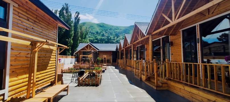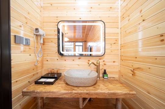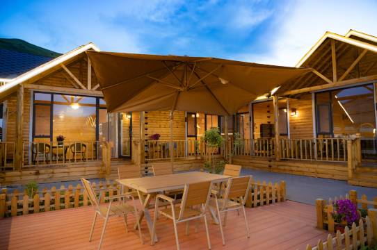 到了现场看到漂亮的小木屋和院子都是新的,太惊喜了!很庆幸取消了原定的那家,超级幸运,这家比周围的都好十倍!无论是设计还是舒适度都非常满意,床垫舒服,深度睡眠,其他各种设施都齐全。一家人坐在木屋前打牌吃零食,非常开心,而且民宿老板也很热情友好!