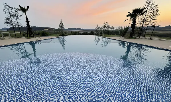 酒店游泳池是无边泳池 等对面的湖修好了应该超级出片