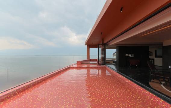 随便任何一个角落都很好看很好拍,除了房间之外,楼下咖啡厅也有很多对着洱海的窗户,氛围感拉满。楼顶的观景台更是日落时分必打卡~随手一拍都是大片。