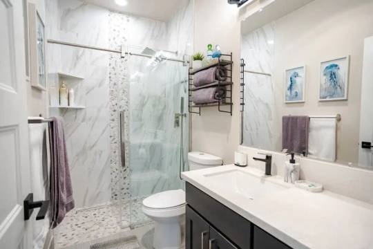 一楼包含带特大号床的主卧室、步入式衣柜和带淋浴的完整浴室!