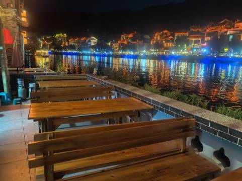 住的是山景大床房,窗外的景色宜人,地理位置不错,依山傍水,对面是镇府机关,治安管理有保障,民宿底楼有吃饭,是湖景餐厅,老板烹饪手艺不错,可以边吃饭边欣赏舞阳河两岸的景色,晚上7.15亮灯,两岸景色就更美不胜收了,老板还赠送杨梅汁味道好极了,民宿出门右转离青龙洞,祝圣桥五,六分钟很近,一次很愉快的旅行体验,也感谢携程平台让我能轻松愉快的潇洒走一回。