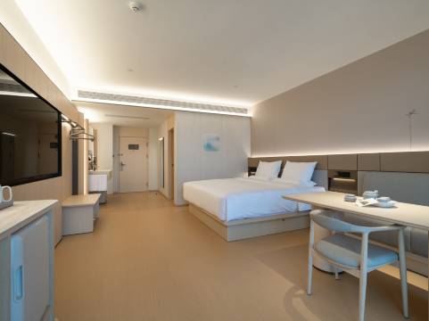 酒店是华住酒店集团旗下品牌-全季5.0新版本一“晓山青”。在审美、体验、空间、商业模式等方面都进行了迭代与升华。全季"晓山青"延续了全季品牌一贯的东方审美,将苏词中的人文意趣和山水间的朦胧意境注入到酒店空间内,给人以自在、从容、松弛的感受。在宾客体验上,全季"晓山青"增加了休闲区的面积,更好地满足了商旅客一边办公阅读,一边品茶的功能需求。客房内智能语音客控也让住客能用更少的动作,享受到更多更贴心的服务。