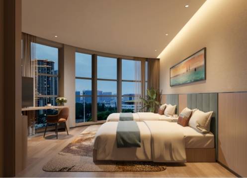 整体装饰浪漫别致,客房用色温馨,设计罗曼唯美;房内设施设备完善齐全,为宾客打造惬意睡眠空间,尽享愉悦。