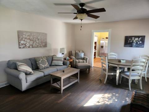步入前门,宽敞的门厅映入眼帘,您可以挂放外套和物品。客厅拥有落地窗,配备舒适的沙发、大屏幕电视和餐桌。然后步入餐厅厨房,映入眼帘的是洁白的橱柜和对比鲜明的花岗岩台面。这里配备了您所需的一切设施——微波炉、Keurig咖啡机和基本厨房电器(没有洗衣机/烘干机)。