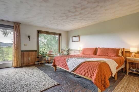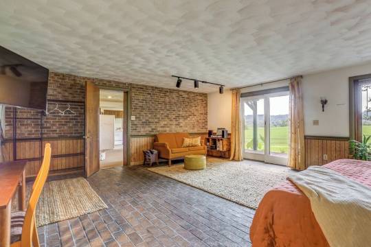 无论室内室外,宾客都能找到充足的活动空间。每间卧室都位于独立的楼层,每层楼都设有浴室(三楼的主卧配有独立卫浴)。房屋的一楼是独立套房,配备一间带特大号床的卧室、一间带淋浴的完整浴室、一个设备齐全的厨房、一个带双人沙发床的起居室,以及一个宽敞舒适的门廊,可饱览美景。您将从这里进入房屋,无需上下台阶即可直接从车道进入。非常适合有行动不便人士的团体入住。房屋的其他部分则需要上下台阶。您可以在前露台上享用晨间咖啡,欣赏美景。到了晚上,这里是观赏璀璨星空的**地点。露台上还配备了燃气烧烤炉供客人使用。即使下雨天也不用担心,大家可以聚集在客厅里巨大的皮沙发上,一起看电影或聆听雨水敲打天窗的声音。完美!两个家庭结伴度假,一定会喜欢这里配备的两个设备齐全的厨房(一个位于主层,一个位于一楼),这样大家可以根据自己的时间安排烹饪和用餐。当然,主层也设有充足的座位,方便大家一起用餐。聆听马蹄的哒哒声,观看阿米什人的马车缓缓驶过。如果您足够幸运,或许会赶上他们田间劳作的场景,那将是一幅令人赏心悦目的画面;从这栋房子里观看,宛如置身于电影场景之中。