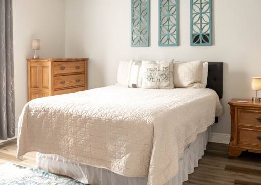 还有两间卧室,一间配有一张全尺寸床,另一间配有两张单人床。