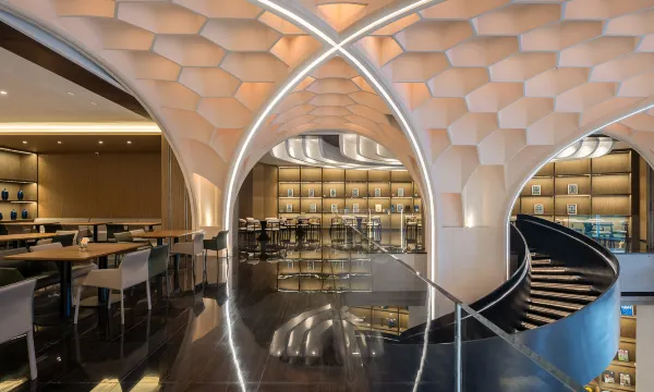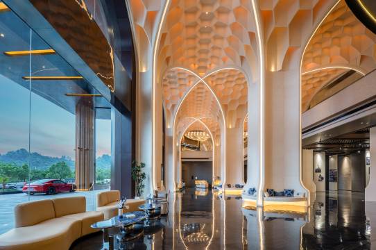 米蓝国际酒店是由北京七十二创设计的贵州高端非遗蓝染文化酒店,不仅提供奢华的住宿与完善的设施,更致力于成为贵州非遗文化的活态展示窗口。酒店本身就是一件融合传统与现代的艺术品,大堂穹顶设计灵感源自侗族鼓楼,六边形蜂巢结构嵌以彩灯,光影流转间诉说着苗山侗水的千年传奇,大堂中央一幅‘扎染‘制成的巨型艺术装置,致敬苗族神话“蝴蝶妈妈”,已成为榕江新晋文化地标,大堂地板同样呼应六边形纹理,与穹顶共同演绎非遗的当代美学,前台区点缀着苗族银饰造型台灯,过道则以侗族鼓楼剪影和蓝色主题,无时无刻不在彰显‘贵州非遗‘与‘蓝染‘的独特魅力。从恢弘的建筑设计到细微的客房用品,无不凝聚着贵州非遗传承人、手工艺者与当代艺术家的匠心独运,为您带来沉浸式的文化体验之旅。 酒店坐拥榕江’村超‘核心区位,距离激情澎湃的村超球场咫尺之遥,尽览璀璨‘村超‘活动烟花盛景,当夜幕降临,绚烂烟花在窗前绽放,您足不出户即可独享这份震撼与浪漫,为旅程增添难忘体验和时光。